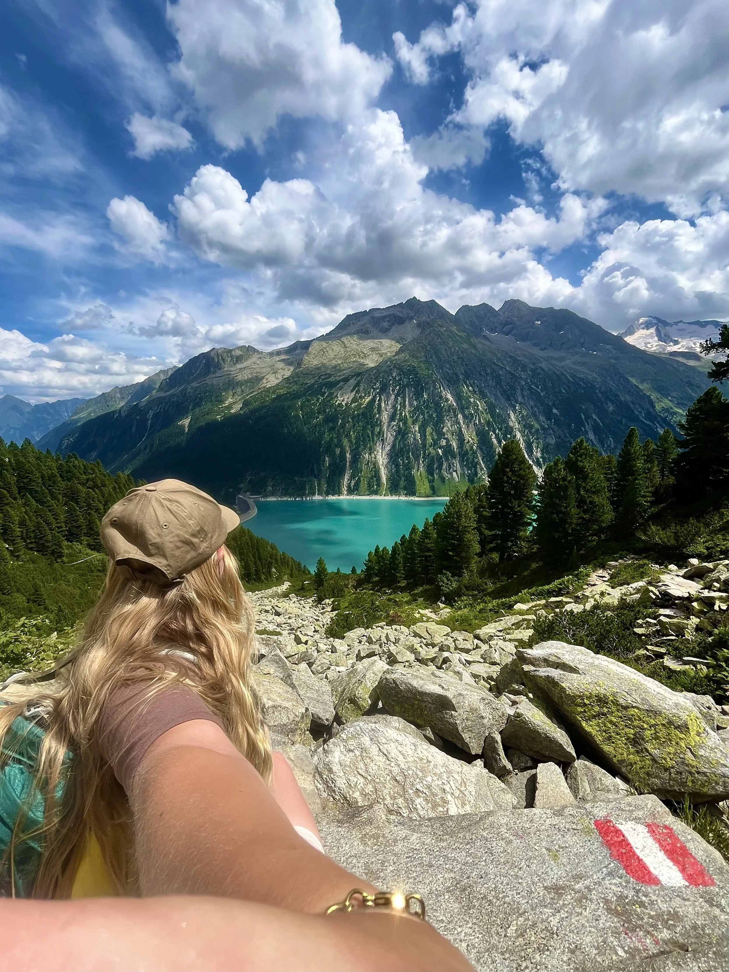 To continue towards Olpererhütte, take trail 536 signposted just outside the hut’s front door and continue on a descent towards the gorgeous Friesenberg Lake (Friesenbergsee).